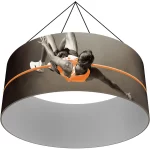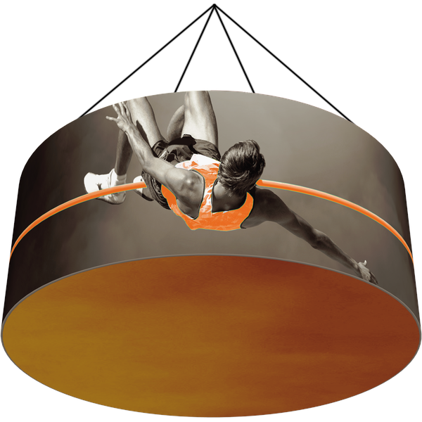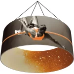 Zipper pillowcase stretch fabric graphics are coupled with lightweight aluminum tube structures to deliver impactful messaging from above. Graphics are durable and dry-cleanable.