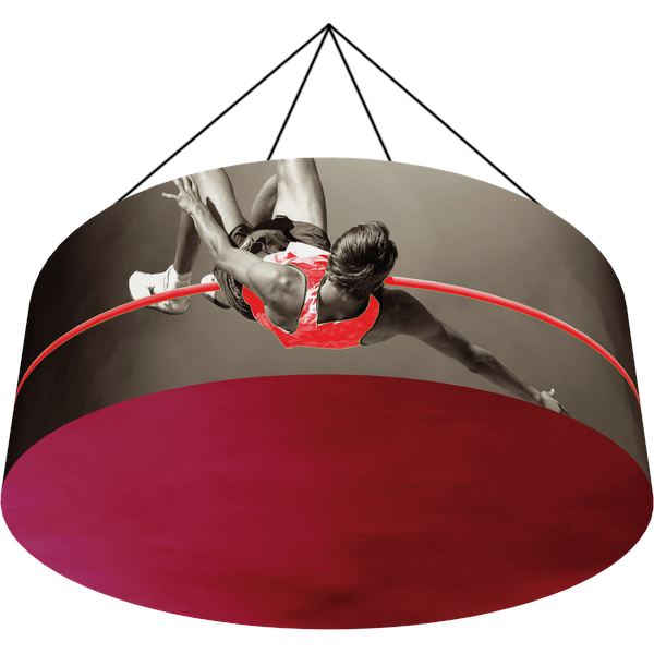 Zipper pillowcase stretch fabric graphics are coupled with lightweight aluminum tube structures to deliver impactful messaging from above. Graphics are durable and dry-cleanable.