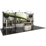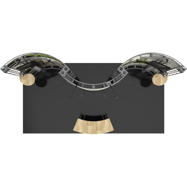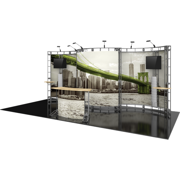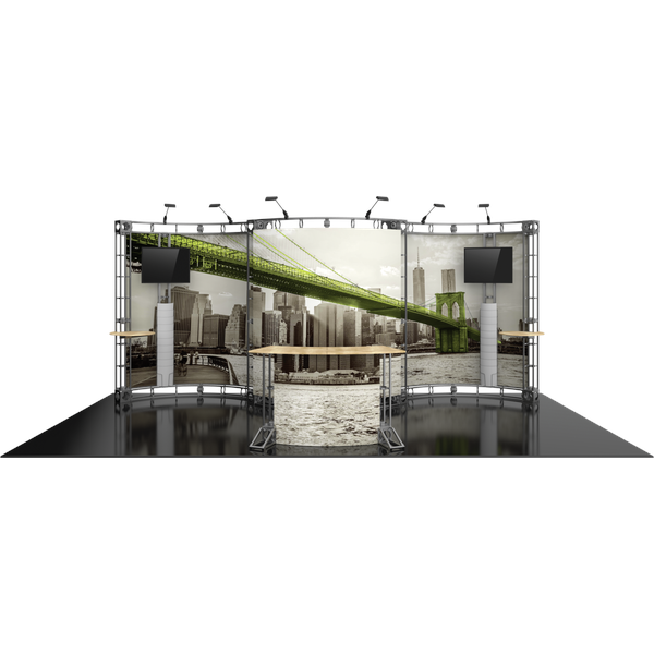 The Apex 10ft x 20ft inline Orbital Express Truss™ exhibit is a professionally designed “off-the-shelf” kit that comes complete with all the parts, fixtures and fittings you need to create a successful exhibit, including steel truss lengths, connectors and accessories. Apex features a curved front counter with space for messaging, and dual monitor mounts, tabletops and literature racks that attach to the backwall and provide additional space for branding and displaying printed materials. Brand messaging pops on dye-sublimated fabric graphic panels. Apex also includes six low voltage spotlights that illuminate the exhibit. This versatile system can be reconfigured in multiple ways and combinations using the same parts.