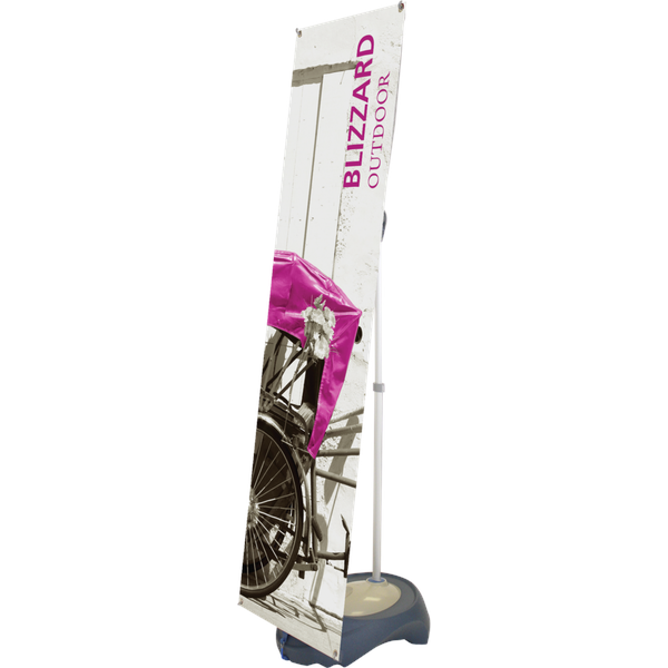 The Blizzard Outdoor Banner Stand is a durable, superior quality display. The banner is adjustable in both width and height, allowing for multiple graphic size options. The large base provides stability, and can be weighed down with either water or sand.