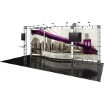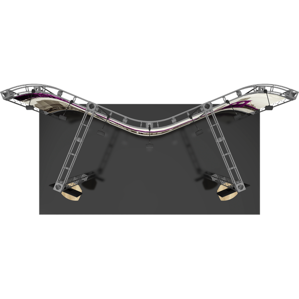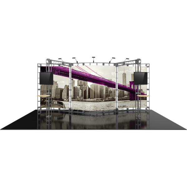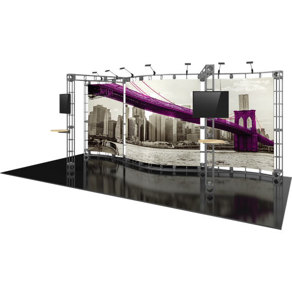 The Callisto 10ft x 20ft island Orbital Express Truss™ exhibit is a sleek modular display kit with a gently curving frame that creates a dynamic appearance. Callisto features three dye-sublimated fabric graphic panels covering the backwall, and two arms that extend to hold dual tabletops and monitor mounts ideal for additional digital display. Including seven low voltage spotlights that illuminate the exhibit, Callisto ensures that your message pops! This versatile system can be reconfigured in multiple ways and combinations using the same parts.