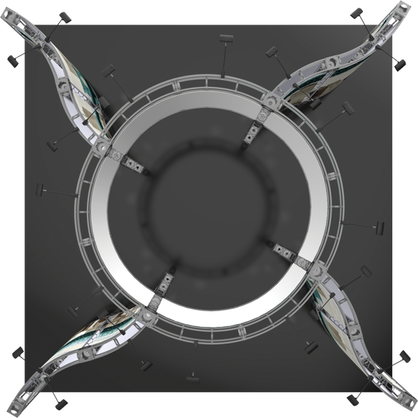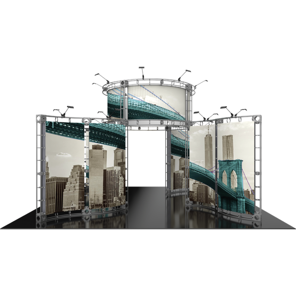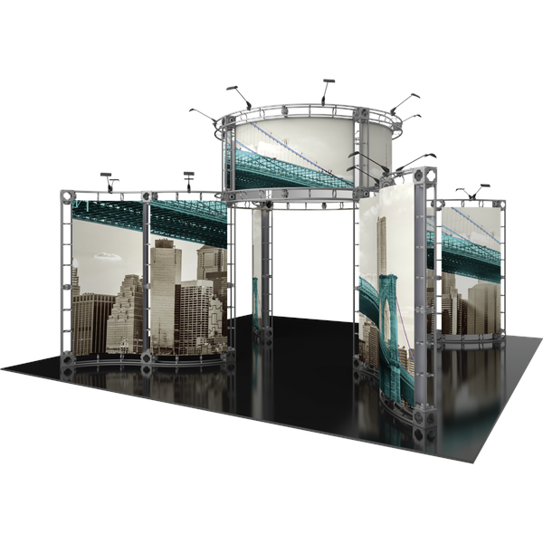 The Canis 20ft x 20ft island Orbital Express Truss™ exhibit is a modern, contemporary “off-the-shelf” modular kit that comes complete with numerous display accessory options to complement its industrial steel truss frame. Canis features four gently curving graphic walls branching out from a central open ring structure that rises high to broadcast branding. The entire exhibit is illuminated by 24 low voltage spotlights for maximum visibility. This versatile system can be reconfigured in multiple ways and combinations using the same parts. Graphic options include dye-sublimated fabric or UV printed rollable PVC graphics.