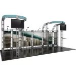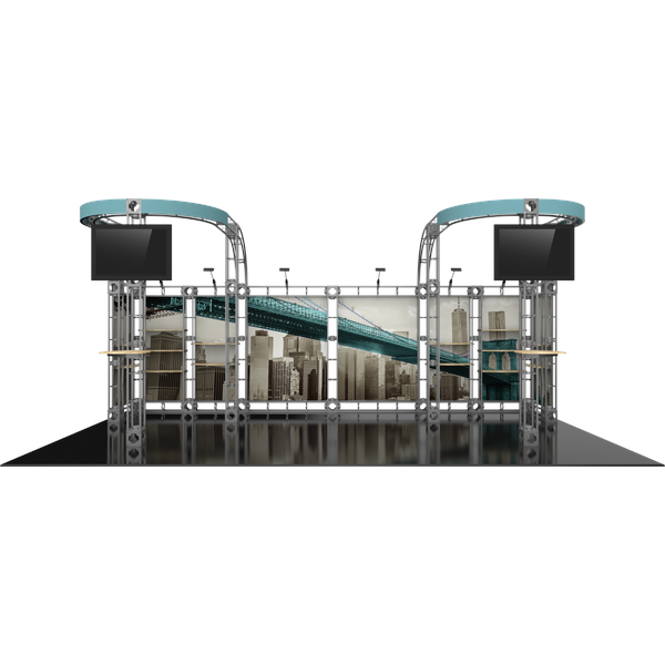 The Cepheus-2 10ft x 20ft inline Orbital Express Truss™ exhibit is a professionally designed “off-the-shelf” kit that comes complete with all the parts, fixtures and fittings you need to create a successful exhibit, including steel truss lengths, connectors and accessories. Cepheus-2 features 14 straight shelves that can be adjusted to any height across the backwall, two tabletops and six low voltage spotlights that illuminate the backwall and messaging. Monitor mounts are sold separately. This versatile system can be reconfigured in multiple ways and combinations using the same parts. Choose from dye-sublimated fabric or UV printed rollable PVC graphics.