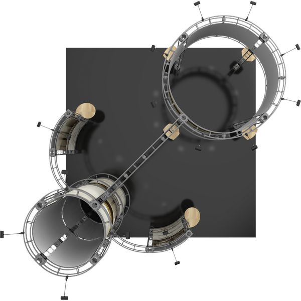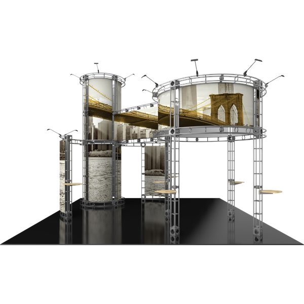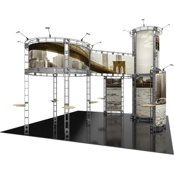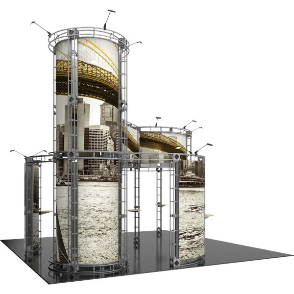The Corvus 20ft x 20ft island Orbital Express Truss™ exhibit provides exhibitors with the impact of a fully custom exhibit in an “off-the-shelf” modular display kit. The striking Corvus kit features a dominating tower that rises over 15ft to clearly project brand messaging above the show floor! Graphic panels accent the tower, and connect to an open, circular structure ideal for meeting with visitors. With six tabletops throughout the exhibit, there is plenty of room for displaying product or printed materials. Corvus is illuminated by 20 low voltage spotlights that make messaging stand out. The Corvus reconfigures into multiple sizes and combinations using parts contained in the kit. Choose from dye-sublimated fabric or UV printed rollable PVC graphics.