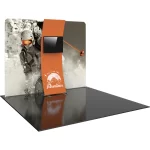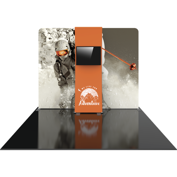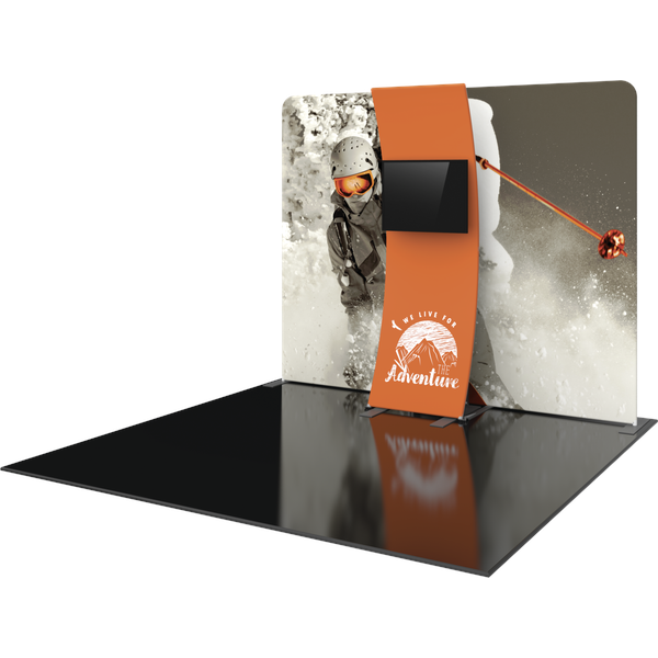 Formulate® Designer Series 10ft Fabric backwall Kit 06 is sophisticaed and sharp looking display that includes an aluminum tube frame featuring snap button/spigot connections, a tubular kiosk supporting a medium monitor mount for multimedia display and simple pullover zipper pillowcase fabric graphics. Designer Series Kit 06 comes in two portable, expandable wheeled transit cases for easy storage and transport. Assembly and graphic attachment is easy – simply pull the pillowcase fabric graphics over the frame and zip.