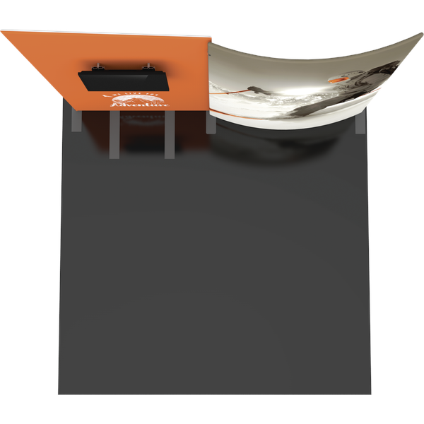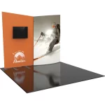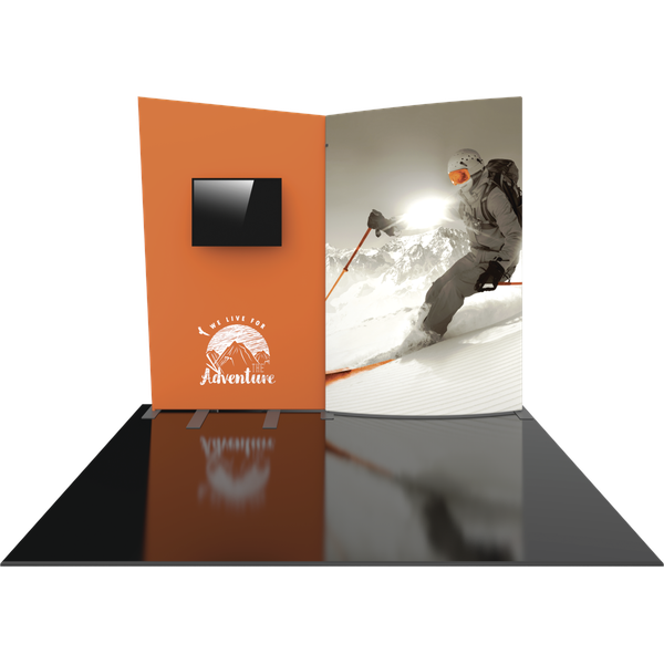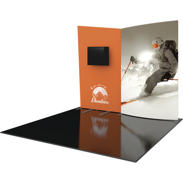 Formulate® Designer Series 10ft Fabric backwall Kit 09 has unique stylistic features and shapes, is portable and is easy to assemble. The two aluminum tube frames features spigot connections and zipper pillowcase fabric graphics. A curved panel draws the eye, and integrated monitor mount makes it easy to incorporate digital messaging into the backwall. Designer Series Kit 09 comes in two portable, expandable wheeled transit cases for easy storage and transport. Assembly is easy – simply connect the tubes, pull the pillowcase fabric graphics over the frame and zip.