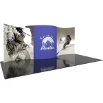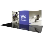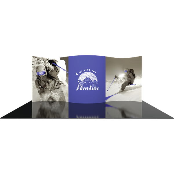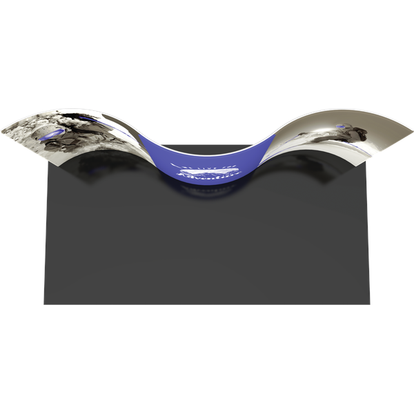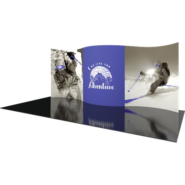 Formulate® Designer Series 20ft Backwall Kit 01 display has organic, flowing shapes and is portable and easy to assemble. The kit includes an aluminum tube frame with snap-buttons/spigot connectors and zipper pillowcase fabric graphics. Simply connect the tubes, pull the pillowcase fabric graphic over the frame and zip.