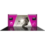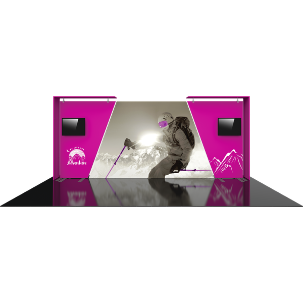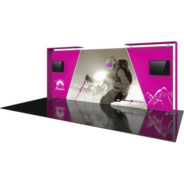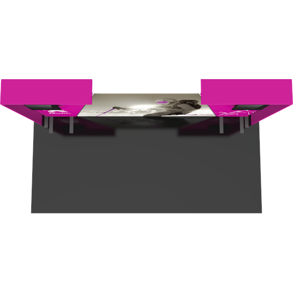 Formulate® Designer Series 20ft Backwall Kit 07 is a sophisticated, modern and head-turning exhibit. The kit features three aluminum tube structures, two fabric canopies and two monitor mount kiosks for media incorporation. A sure-fire way to make an impression on the trade show floor. Assembly is simple – connect the tube frames, place the monitor kiosks, pull the fabric graphics over the frames and zip.