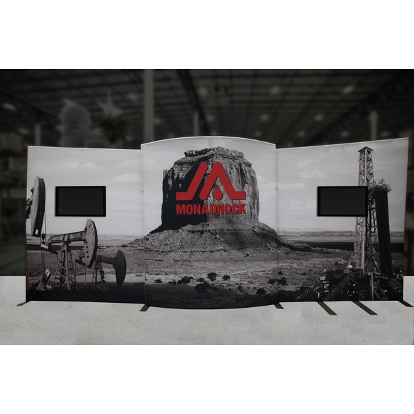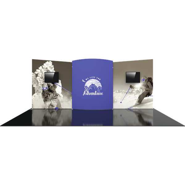 Formulate® Designer Series 20ft Backwall Kit 08 display has unique stylistic features and is portable and easy to assemble. Kit 08 features three aluminum tube frames with snap-buttons/spigot connectors, two monitor kiosks supporting medium monitors and three zipper pillowcase fabric graphics. Assembly is simple – connect the tube frames, place the monitor kiosks, pull the fabric graphics over the frames and zip.
