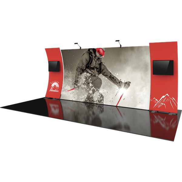 Formulate® Designer Series 20ft Backwall Kit 12 combines multimedia with ample real estate for a prominent message on the center wall. Kit 12 includes three aluminum tube frames with snap-buttons/spigot connectors, three zipper pillowcase fabric graphics and two monitor kiosks that support medium monitors for multimedia presentations. Assembly is simple – connect the tubes, place the monitor mount kiosks, pull the graphics over the frames and zip.