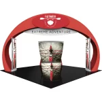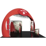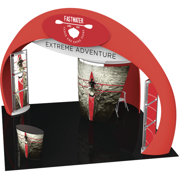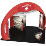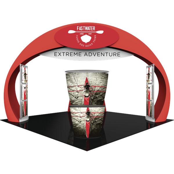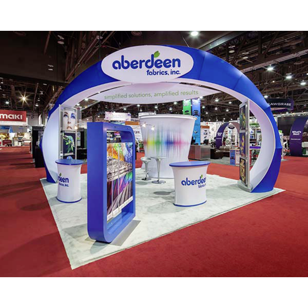 – Kit includes: aluminum tube frames and dye-sublimated zipper pillowcase fabric graphics for the arch structure and four accent graphics; two illuminated displays rectangular displays that anchor the arch, conference room, oval counter and freight/shipping cases