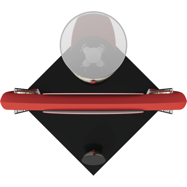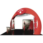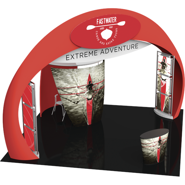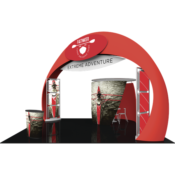 Engage your audience inside this 20′ x 20′ island display at your next event! Formulate® Fusion Kit 08 provides ample floor space for traffic flow, product demonstrations and semi-private meetings. The main arch structure is 15′ 8″ tall and has a footprint that spans 27′ 3″, which requires that it is placed in a 20′ x 20′ exhibit space on a diagonal. Two oval-shaped accents mounted on the sides of the arch provide areas for company branding and messaging. Two structural accent displays are placed on the inside of the archway anchors, each featuring three 29.5″ illuminated squares that can be used to feature product or service images, taglines, branding and more. These displays stand 105″ tall and are 42″ wide. Host meetings in the semi-private conference room, which can fit a 36″ diameter bistro style table four chairs or stools. The oval fabric counter can be used for reception and storage.