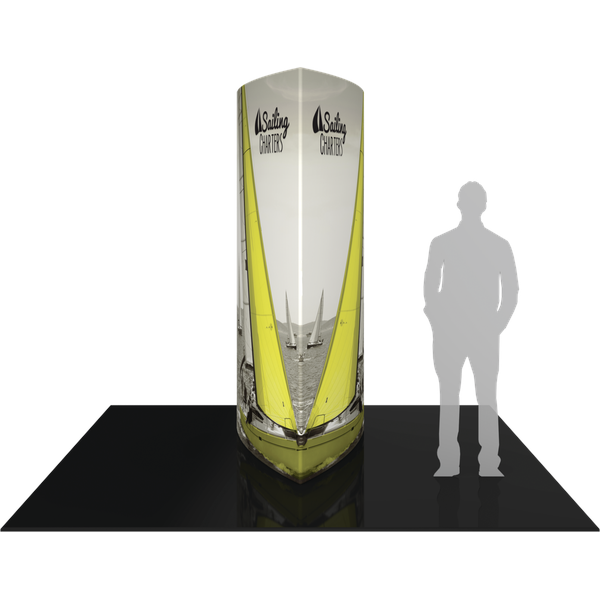 The Formulate® 8ft Shield tower combines the latest developments in fabric printed technology with aluminum tube frames to add dimension, decor and sculpture to any event, stage set, trade show booth or interior space. Formulate towers accommodate internal LED lighting. Accent LED light not included, but can be incorporated to add glow within the structures.