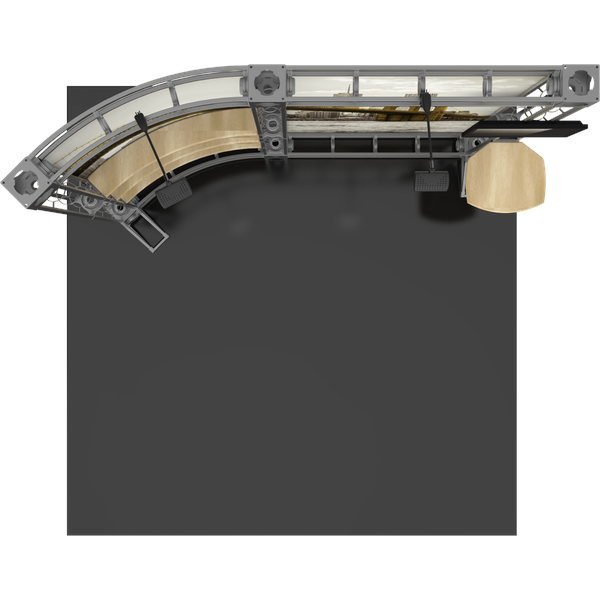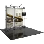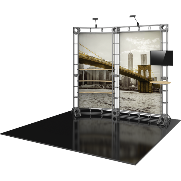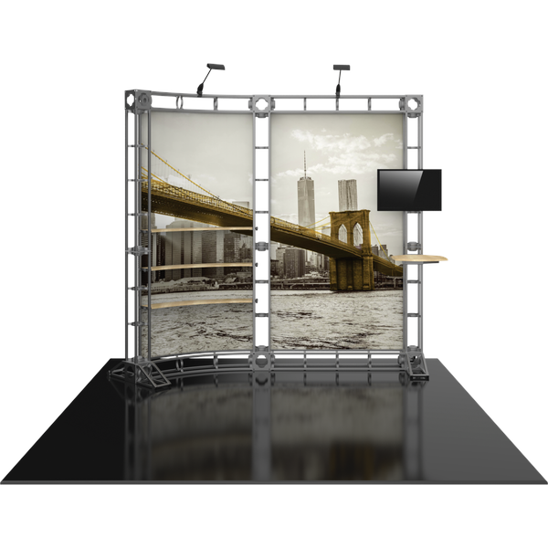 The Hercules 10 10ft x 10ft inline Orbital Express Truss™ exhibit is a high-quality, custom off-the-shelf kit that utilizes steel truss pieces to create a professional looking display. Hercules 10 features a slightly curved backwall, split into two sections, one including three adjustable height shelving. A tabletop which attaches to the backwall provides additional display opportunities. Spotlights are included to draw attention to graphics and messaging. Choose from dye-sublimated fabric or UV printed rollable PVC graphics.