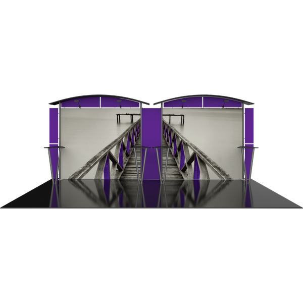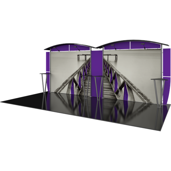 Linear™ Pro 10′ x 20′ Modular Backwall Kit 26 is the perfect portable display for a custom, contemporary feel. Kit 26 combines Hook and loop-applied graphics and graphic accents with a custom graphic canopy accent and four tables. Tables provide additional space for displaying products, literature and more, and our available in four color options. Two 50 watt display lights are included to highlight graphics.
