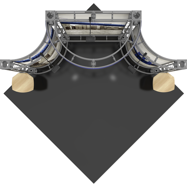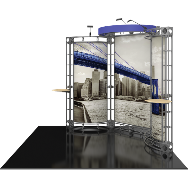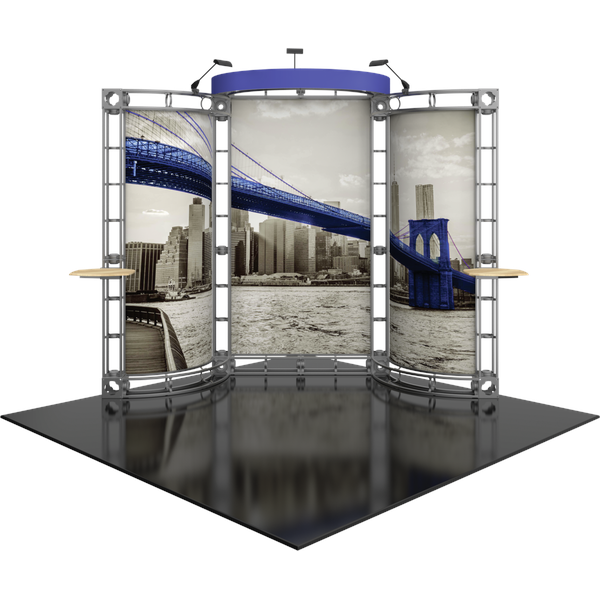 The Lyra 10ft x 10ft inline Orbital Express Truss™ exhibit is a professionally designed “off-the-shelf” kit that comes complete with all the parts, fixtures and fittings you need to create a successful exhibit, including steel truss lengths, connectors and accessories. The remarkable Lyra backwall features a gently curved center panel, with two curved, angled sections extending into the exhibit space. A projecting curved header emphasizes branding on the busy show floor. Lyra is accented by two tabletops and three low voltage spotlights that illuminate the messaging to help it pop on the show floor. This versatile system can be reconfigured in multiple ways and combinations using the same parts. Choose from dye-sublimated fabric or UV printed rollable PVC graphics. Can also ship in 4 OCH2 cases (each): 52″L x 29″H x 15″D