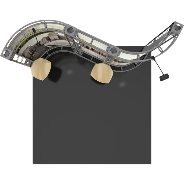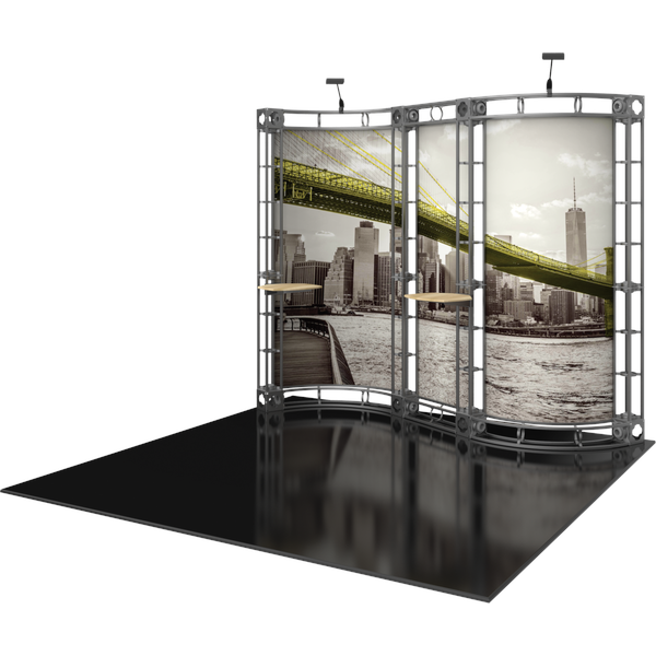The Mercury 10ft x 10ft inline Orbital Express Truss™ exhibit is a professionally designed “off-the-shelf” modular kit that features a unique, serpentine-curved backwall. The curving graphic panels of Mercury draw the eye, and two tabletops attached to the backwall and two low voltage spotlights accent the exhibit. Mercury Truss is able to switch into multiple configurations depending on your display needs. Choose from dye-sublimated fabric or UV printed rollable PVC graphics. Can also ship in 4 OCH2 cases (each): 52″L x 29″H x 15″D.