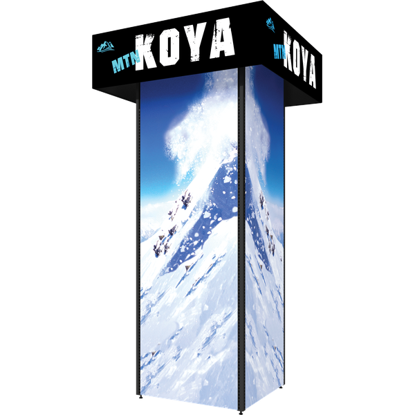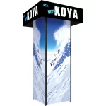 – Center tower holds four 36″W x 117″H SEG push-fit fabric graphics and can hold a multitude of fixtures for merchandising