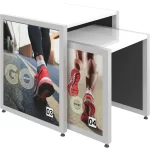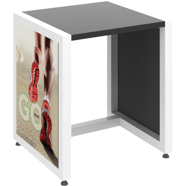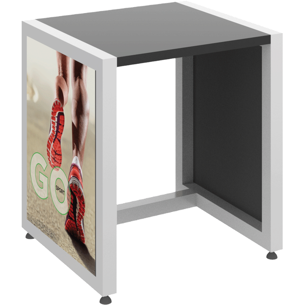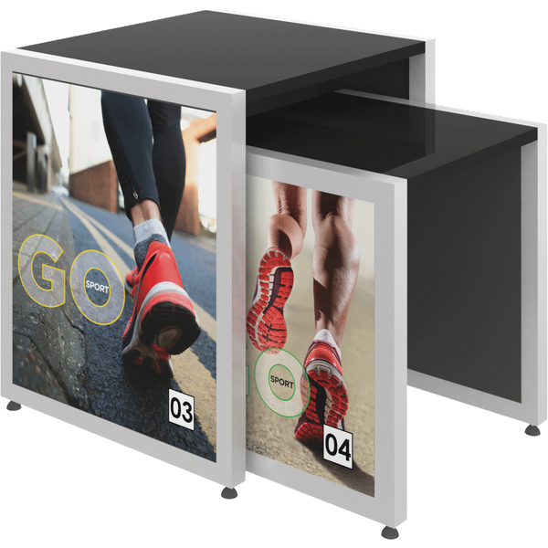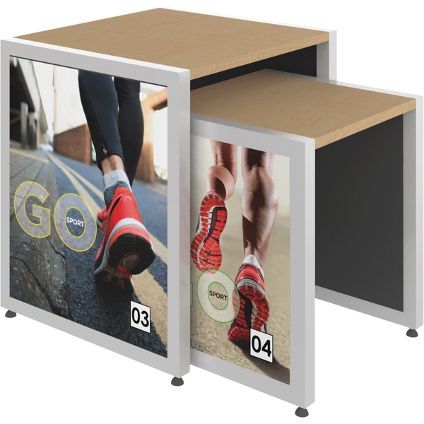 The MODify Nesting Table 04 is a perfect addition to any space. The sturdy metal frame provides excellent support and stability, while the elegant wooden tabletops add a touch of warmth and sophistication to any room. SEG push-fit fabric graphics are fantastic options for each side, and provide a creative way to show branding, messaging and color. MODify Nesting Table 04 slides underneath Nesting Table 03; the nesting feature makes the tables versatile and blends both style and function.