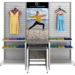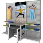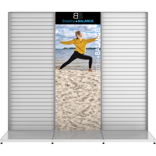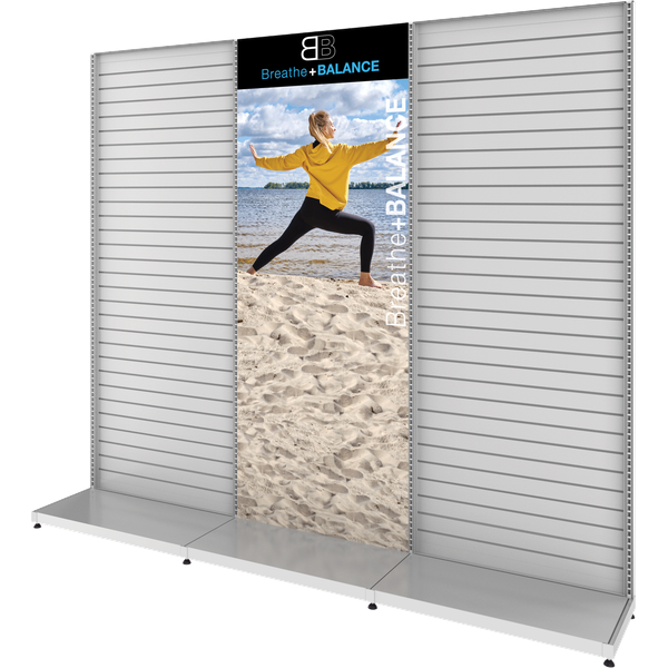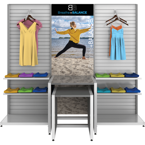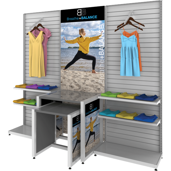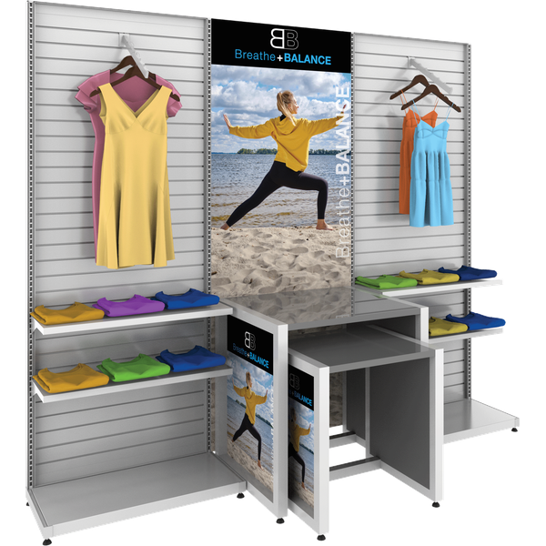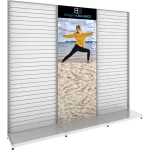 MODify Single Sided Kit 03 features two slatwall panels (right/left) and one center graphic panel. Customize your kit with fixtures such as shelves, waterfalls and hooks, or furniture like tables and risers. The center SEG push-fit graphic panel can be effortlessly replaced at any time, allowing you to keep your display up-to-date and on-trend.