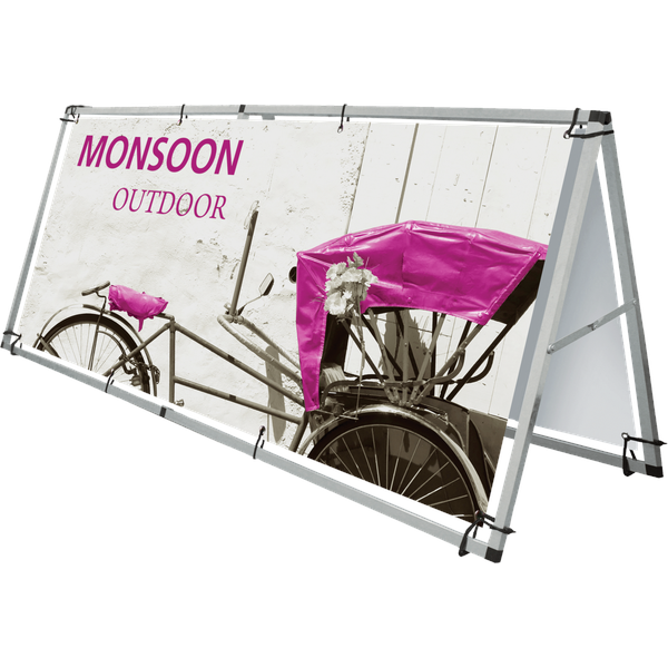 Monsoon Outdoor Sign Stand is a large format banner ‘A’ frame made from lightweight aluminum, ideal for use with eyelet banners. Monsoon is very easy to use, reusable and is the perfect graphics carrier for venues, events, exhibitions, promotions and indoor or outdoor shows.