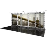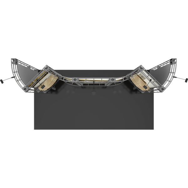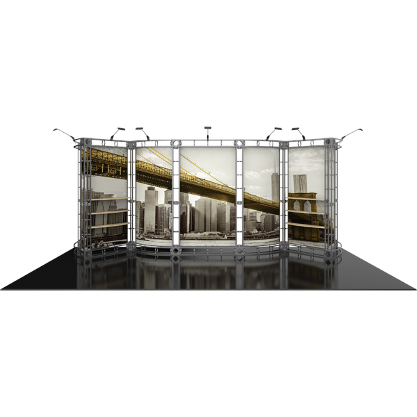 The Omicron 10ft x 20ft inline Orbital Express Truss™ exhibit utilizes a sturdy steel truss frame to create a professional looking modular display. The center section of the backwall gently curves to emphasize branding, and is accented by two convex wing panels on either side provide space for adjustable shelving, and prominently feature both messaging and products. Graphic panels are accented by seven low voltage spotlights. This versatile system can be reconfigured in multiple ways and combinations using the same parts. Choose from dye-sublimated fabric or UV printed rollable PVC graphics.