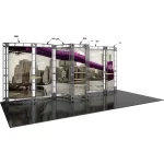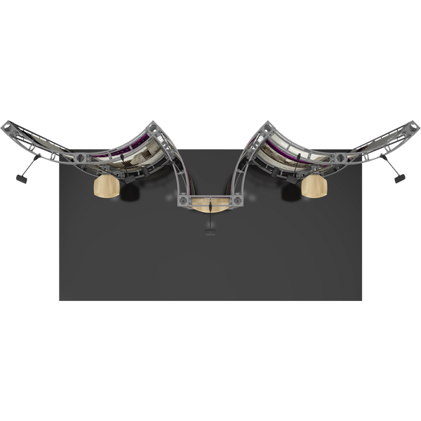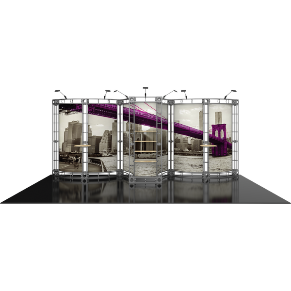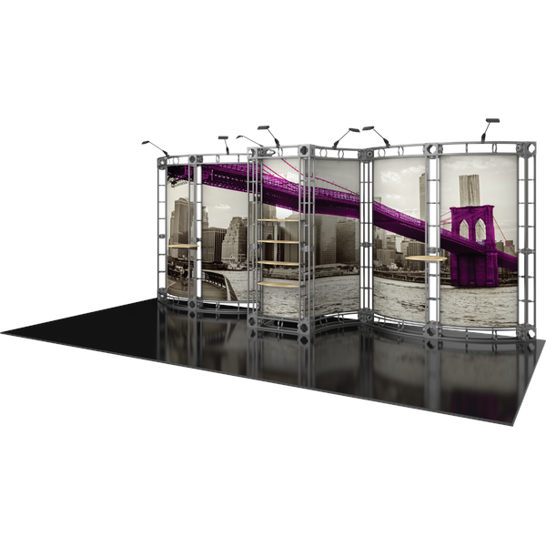 The Phoenix 10ft x 20ft inline Orbital Express Truss™ exhibit is an off-the-shelf modular display kit that provides the impact of a fully-custom exhibit. True to its name, Phoenix spreads its wings across the 20ft space, and features a central section with adjustable shelving, accented by two wings with additional tabletop space. The gently curved backwall sections draw attention to messaging, and are illuminated by seven low voltage spotlights. This versatile system can be reconfigured in multiple ways and combinations using the same parts. Graphic options include dye-sublimated fabric or UV printed rollable PVC graphics.