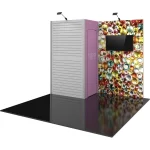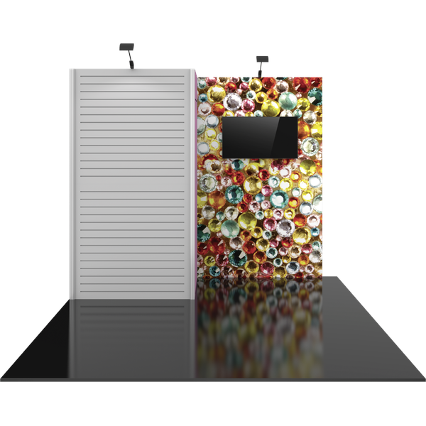 The 10ft x 10ft inline Vector Frame™ Kit 25 is an innovative and contemporary exhibit that provides a sleek appearance and excellent features and functionality. Kit 25 couples vibrant, dye-sublimated push-fit fabric graphics with simple extrusion frames. Kit 25 includes accent lighting, a monitor mount, an entire slot wall to hang merchandise from and lockable closet for storage.