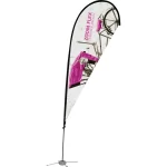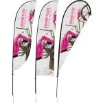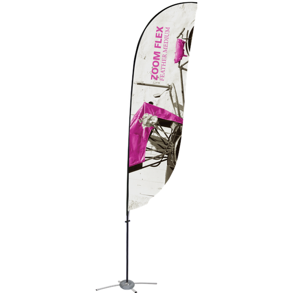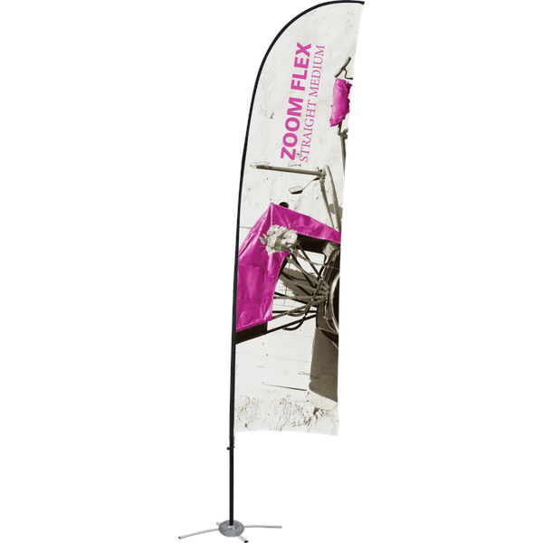 The Zoom Flex Medium Flag is the perfect advertising display flag for outdoor use. The full fiber pole and wind-resistant flag are designed for the graphic to rotate in wind, providing a dynamic option for your display needs. Flags are available in three shapes – Feather, Straight, and Teardrop. The height varies from 116″ to 138.63″ depending on the flag shape, and flags have the option for single or double sided display graphics. Ground stake and storage sleeve are included. Product not designed to withstand adverse weather or high wind. Weather damage is not covered by product warranty.